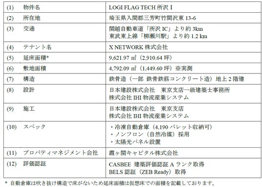 なお、『COLD X NETWORK』の第1号案件となる『LOGI FLAG TECH所沢I』においては、冷凍自動倉庫内の容量の約半分である2,000パレット分の荷物を約5年間SBSゼンツウ株式会社(本社:東京都新宿区、代表取締役:池田伸之)から寄託を受ける予定です。