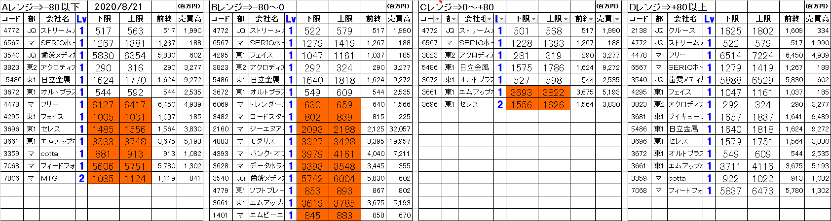 2020/8/5(水曜日) 今日のシステムトレードの仕掛候補一覧です。今日の日経の寄り付きはAレンジでしたね仕掛表の各レンジは日経平均の前日終値比で以下のよ... ...続きを読む