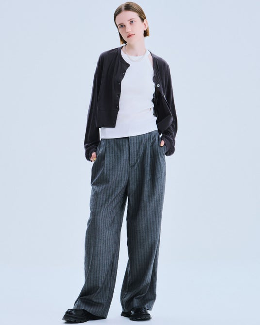 カジュアルにもフォーマルにも使える、ワイドシルエットのパンツです。ニュアンスのあるヘリンボーンの生地はどのカラーとも良く合い、単調な印象にならず奥行きのあるコーディネートにしてくれます。