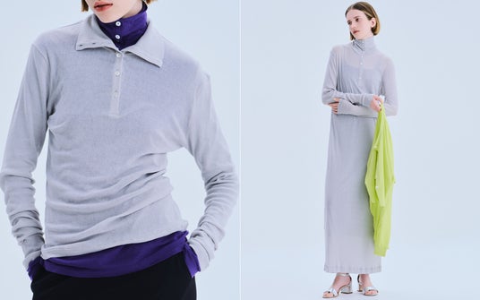 首元が特徴的なヘンリーネックとタートルネックを掛け合わせたロンTを2種類の生地でつくりました。ハイゲージコットンカシミヤは、ライム、パープル、チャコールグレーの3色。同じデザインで、ガーゼテレコ素材は、ライトグレーをご用意しました。