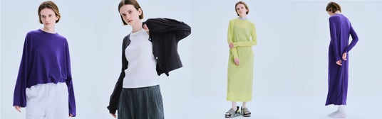 10月24日(木)午前11時にデビューするアイテムは9種類。今回使用している素材はハイゲージコットンカシミヤ、ガーゼテレコ、ウールヘリンボーンの3種類です。素材は、今後のシーズンによって準備できる種類も数も異なるため、その時々の出会いをたのしむようにご覧いただけるとうれしいです。