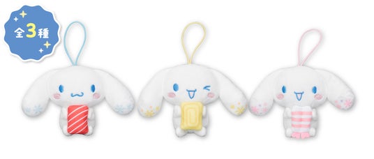 シナモンがおすしのネタをギュっと抱いているコラボ限定マスコットです。