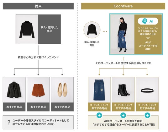 ・具体的な活用方法「Coordware」は、EC事業者からユーザーの行動・購買情報を受け取り、生成AIによる趣味嗜好の分析を行います。その分析にもとづいて、下記のようなパーソナライズドコンテンツを自動生成します。