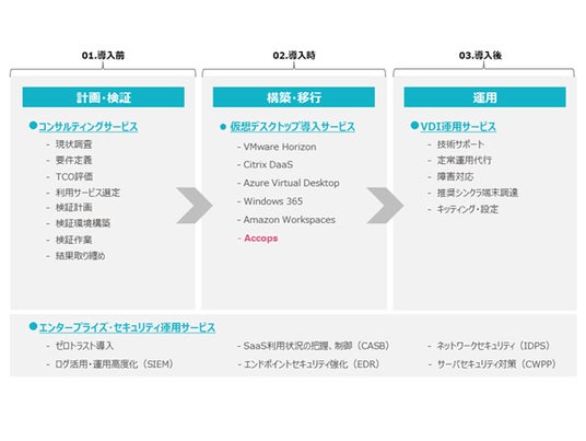 「Accops」シリーズはVDI環境全体のアセスメント、環境見直しのグランドデザイン策定といった計画・検証フェーズから、VDI導入・運用、その後の改善提案といった運用フェーズまでを包括した統合仮想化ソリューションサービスです。「Accops」シリーズの主な特長は以下の通りです。