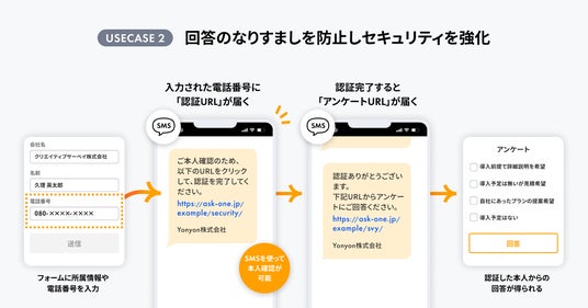 「CPaaS NOW」のSMS送信機能により、「Ask One」および「Fan Fan Fan」で生成したフォームに入力された携帯電話番号に認証メッセージを送信。本人確認後にフォーム上で認証情報を確認し、認証済みの顧客にのみページを表示することで、なりすましの防止を実現。