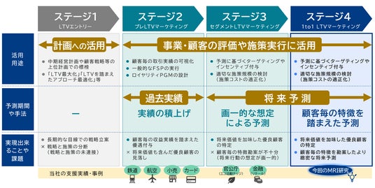 株式会社三菱総合研究所(代表取締役社長:籔田健二、以下 MRI)は、Life Time Value(以下、LTV)に基づくマーケティングを実現するコンサルティングメニュー「LTVマーケティング」の提供を開始します。戦略立案から施策実行までを4段階のステージで定義、全段階を網羅する一連のメニューをそろえ、顧客ロイヤルティ向上を目指す全てのお客さまの科学的・定量的なマーケティング活動を支援します。