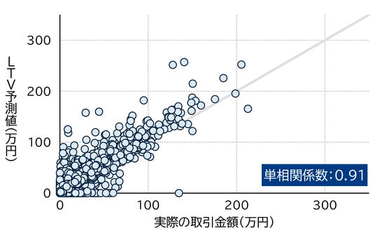 図2はAbeモデルの予測精度を示す結果です。縦軸はモデルによるLTV予測値、横軸は実際の取引金額で、一つのプロットが一人の顧客を指します。45度線近辺にプロットが分布し、相関係数0.9以上と高い予測精度が確認されました。