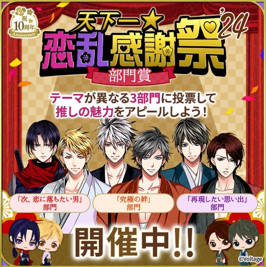 ファンの皆様へ感謝を込めてアプリでは豪華特典を用意した投票イベント「天下一☆恋乱感謝祭’24」など10周年記念の特別企画を多数開催しております。