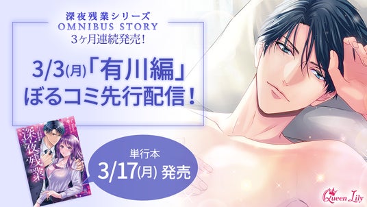 株式会社ボルテージ(本社:東京都渋谷区 代表取締役:津谷 祐司)は、シチュエーションボイスドラマレーベル「Queen Lily」の人気シリーズ「深夜残業」のOMNIBUS STORY「有川了 ~おはようからおやすみまで~」(CV.久喜大)を電子コミックストア「ぼるコミ」にて3月3日(月)より先行配信を開始したことをお知らせいたします。