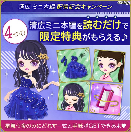 清広のミニ本編ストーリーを期限までに読み終えると、清広からのお手紙や、「星舞う夜のみにどれす」などのアバターが手に入ります。