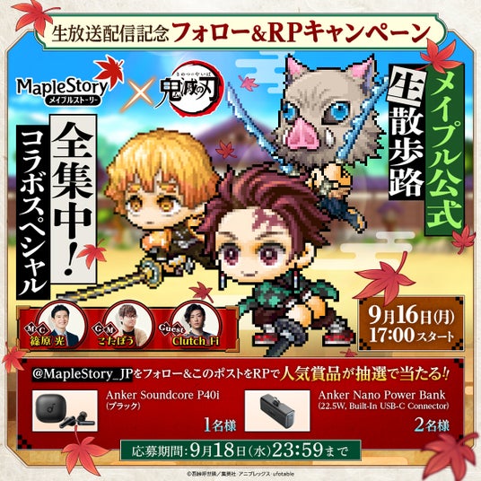 9月19日(木)のコラボ開始に先駆けて配信する今回の生放送は、ゲストに人気ストリーマーのClutch_Fiさんをお招きしてお送りいたします。放送では、メイプル史上最大規模で開催するコラボイベントの詳細をご紹介するほか、コラボ限定職業「炭治郎」による実機プレイの様子も、一足先にご覧いただけます。その他にも、視聴者参加型コーナーやプレゼント企画など、盛りだくさんの内容でお届けする生放送。どうぞお見逃しなく!