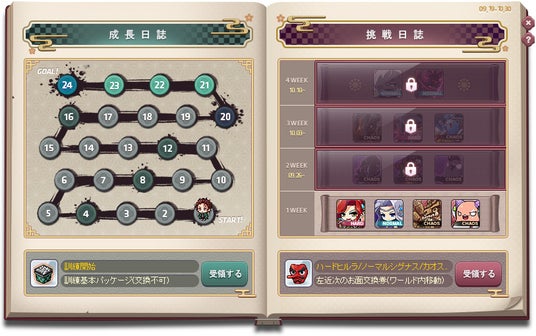 本イベントは「成長日誌」と「挑戦日誌」に分かれており、個々にイベント進行と報酬獲得が可能です。