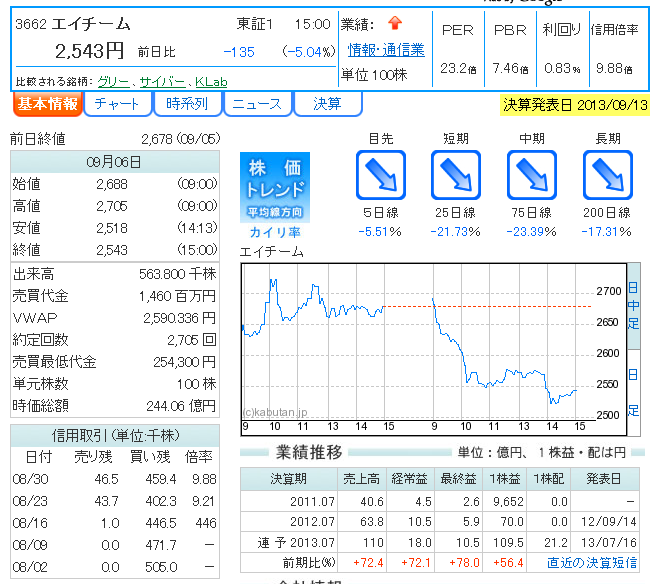 エイチーム が9月13日大引け後(15:00)に決算を発表。13年7月期の連結経常利益は前の期非連結比64.1%増の17.1億円に伸び、14年7月期も前期比39.7%増の24億円に拡大を見込み、3期連続で過去最高益を更新する見通しとなった。7期連続増収、4期連続増益になる。