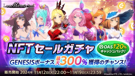 株式会社enish(本社:東京都港区、代表取締役社長:安徳孝平、以下enish)は、2024年11月12日(火)、「GEEKOUT PTE. LTD.(本社:シンガポール、代表取締役:嶋瀬 宏)」と連携し、開発中のモバイルゲームクオリティのブロックチェーンゲーム『De:Lithe Last Memories(ディライズ ラストメモリーズ)』のNFTドールガチャセール(2024年11月12日(火)22:00~11月19日(火)23:59)を開始します。また、本セールは、NFT購入金額のうち最大20%がOASトークンでキャッシュバックされるキャンペーンの対象です。併せて、一定数以上の購入で「羽つき衣装」のNFTが貰えるキャンペーンも同時開催致します。