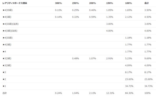 排出対象:通常36種+水着キャラ4種+ドレスキャラ2種+浴衣衣装Ver4種