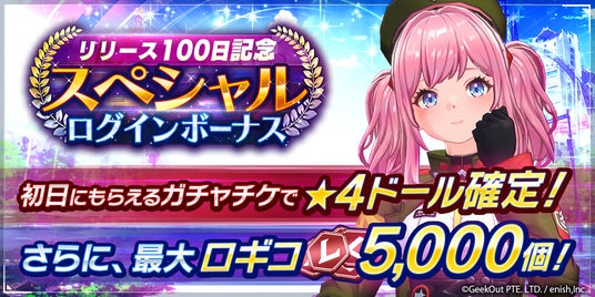 ログイン初日に「リリース100日記念S級以上★4確定ガチャ」のガチャチケットをゲット、さらに最終日までログインすれば、合計5,000個のゲーム内通貨「ロギコ」が手に入ります。