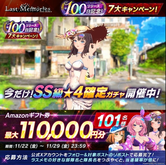 S級以上★4確定ガチャチケットをはじめとする「リリース100日記念!7大キャンペーン」の開催を記念し、最大110,000円分のAmazonギフトカードが101名様に当たるフォロー&RPキャンペーンを実施いたします。