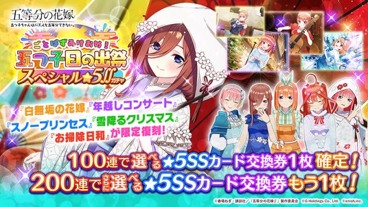 1月1日(水)より、「五つ子日の出祭スペシャル★5SSガチャ 白無垢の花嫁」、「五つ子日の出祭スペシャル★5SSガチャ 年越しコンサート」、「五つ子日の出祭スペシャル★5SSガチャ スノープリンセス」、「五つ子日の出祭スペシャル★5SSガチャ 雪降るクリスマス」、「五つ子日の出祭スペシャル★5SSガチャ お掃除日和」の五つのガチャが登場中です。