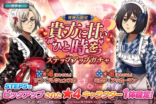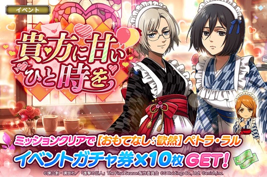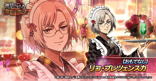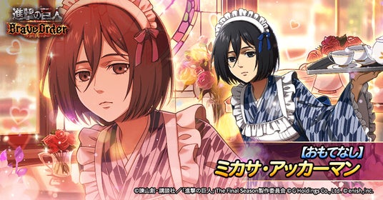株式会社enish(本社:東京都港区、代表取締役社長:安徳 孝平、以下enish)は、アニメ『進撃の巨人』のスマートフォンゲーム最新作「進撃の巨人Brave Order」にて、2025年1月29日(水)より、「貴方に甘いひと時を」を開催!また、本日より新登場の【おもてなし】リコ・ブレツェンスカ、【おもてなし】ミカサ・アッカーマンがピックアップされた「貴方に甘いひと時をガチャ」も開催!その他、最新情報はゲーム公式サイト・ゲーム公式X(旧Twitter)アカウントにて随時公開して行きますので、ぜひご覧ください。