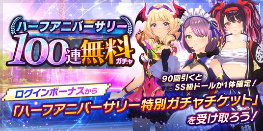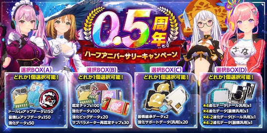 ハーフアニバーサリーを記念し、「ハーフアニバーサリー特別ガチャチケット」とxGEEK(有償)がお得に詰まったパックや、「選べる報酬選択箱」が登場します。他にも一部のパックに含まれる召喚データは、過去に「TOKYOドールズコレクション」で登場した特別な衣装の★4ドールが選択可能となっている特殊なBOXとなっています。