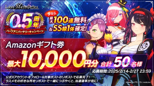 株式会社enish(本社:東京都港区、代表取締役社長:安徳孝平、以下enish)は、「GEEKOUT PTE. LTD.(本社:シンガポール、代表取締役:嶋瀬 宏)」と連携し、開発中のモバイルゲームクオリティのブロックチェーンゲーム『De:Lithe Last Memories(ディライズ ラストメモリーズ)』において、2025年2月14日(金)より、ハーフアニバーサリーキャンペーンを開催いたします。