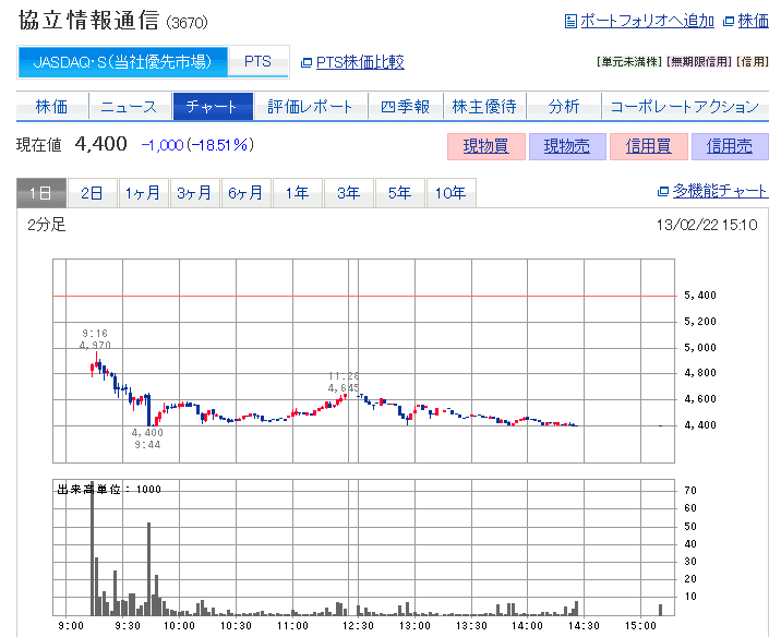 アプリックスIPホールディングス S高??本当かな?気配だけにしては長いけど・・・・材料はなさそう!いつもいつかは上げてくれる銘柄で今は少し幅広いレンジ相場・・・下に抜けそうで怖いけど・・・・協立情報通信も気配だけ??この銘柄は安すぎるとは思うけど壁が壊れると経済統一??いやS高かな?(笑)
