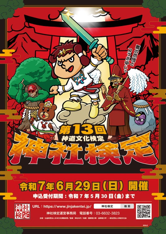 今回のコラボでは鷹の爪団が第13回神社検定のポスタービジュアルに起用され、12月以降全国約8,000ヵ所の神社に掲示される他、公式サイトやノベルティのクリアファイル、実施要項の表紙デザインにも活用されます。