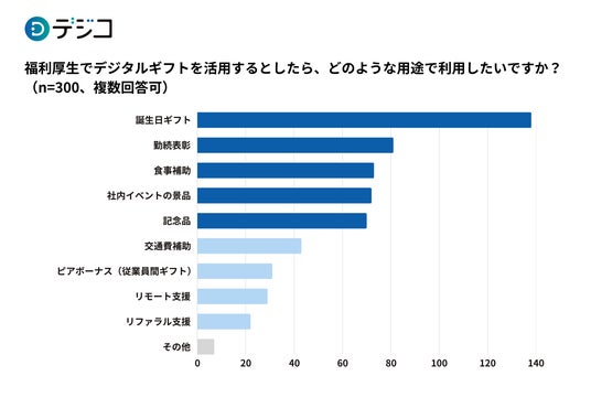 デジタルギフトを福利厚生に活用するとしたら、どのような用途で利用したいか聞いたところ、「誕生日ギフト」、「勤続表彰」、「食事補助」、「社内イベントの景品」「記念品」が上位を占めました。