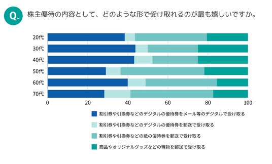 当社が2024年10月に実施した「株主優待に関する意識調査」(※) によると、郵送形式の優待券等を希望する株主が一定数いる一方で、デジタル形式を希望する株主も多く、年代によっては半数近くがデジタル形式を希望しています。