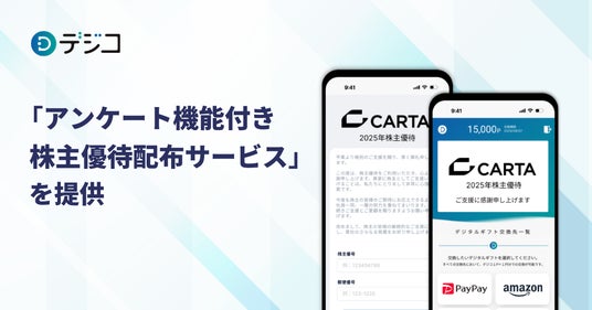 株式会社CARTA HOLDINGSのグループ会社で、マーケティングソリューション事業を展開する株式会社DIGITALIO(東京都港区、代表取締役CEO:古谷 和幸、代表取締役COO:安藤 敦士)が運営するデジタルギフト「デジコ」は、株主とのエンゲージメントを深めるための株主優待プラン「アンケート機能付き株主優待配布サービス」を提供いたします。