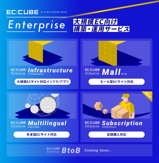 「EC-CUBE Enterprise」は、イーシーキューブに寄せられた大規模で複雑なEC構築相談へのご要望を元に開発された、大規模EC向けに構築からシステム運用まで一気通貫でサポートする最新の垂直統合モデルサービスです。「EC-CUBE Enterprise」は、2024年6月にリリースした「Infrastructure(大規模EC基盤)」のリリースを皮切りに10月には「Mall(モール型EC)」「Multilingual(多言語対応EC)」、そしてこの度、第4弾となる「Subscription(定期購入EC)」をリリースいたしました。更に現在、需要が高い「BtoB(BtoB EC対応版)」も早期にリリースできるよう開発を進めており、スピード感をもってサービス拡充に取り組んでいます。