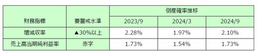 経済環境や景気動向の変化により、倒産のトレンドは常に変化しています。下表のとおり、2023/9から2024/9の1年間で比較すると、各財務指標における要警戒水準の倒産確率も変化が生じていることが分かります。これらの倒産トレンドの変化に対応するために、定期的に倒産実績の集計を行い、格付と倒産確率の乖離が生じないように調整を行っています。