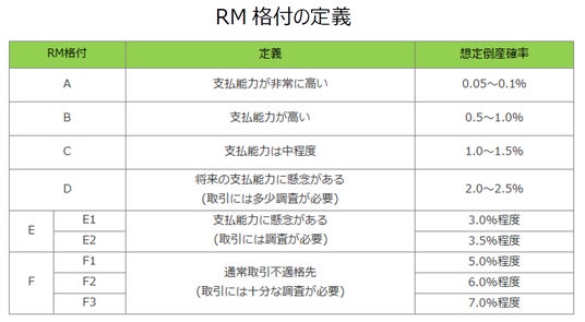 RM格付は、企業を6段階のA格~F格(細分化を含めると9段階)に分類した倒産に特化した与信管理指標であり、その倒産判別力(※)は90%超を維持し高い精度を誇っています。