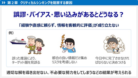 クリティカルシンキングを活用する上で、論理の誤りや偏見・思い込みが影響を及ぼすことがあります。本コースでは、クリティカルシンキングを阻害する要因(誤謬・バイアス・思い込み)について掘り下げ、客観的に考えるためのヒントを学びます。(対象:中堅社員/標準学習時間:1時間)