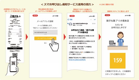 一般的にフードコートで使われる呼び出しベルは、お客様にお渡しした受信機に店舗から信号を送って呼び出しを知らせる仕組みか、大型ディスプレイに呼出し番号を表示させるなど、その場に居なければ呼び出しを見逃してしまうことがありました。本システムでは呼び出しに、呼び出しベルや大型ディスプレイを使わず、お客様のスマートフォンで、前会計レジのレシートに記載されたQRコードを読んでいただき、スマートフォンで呼び出し通知を受け取っていただくシステムです。本システムを導入することにより、お客様は別の場所で買い物をしていても通知を受け取れるようになり、お店も呼出ベルや大型ディスプレイの準備をする必要がありません。