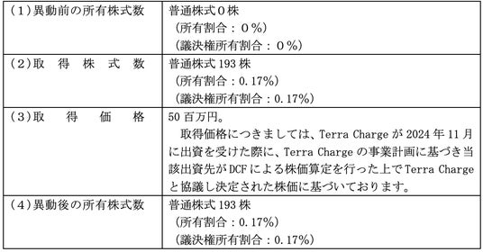 当社の理念「価値創造経営の力で、もう一度豊かになる」のもと、THE WHY HOW DO COMPANY株式会社(本社:東京都新宿区、代表取締役社長:岩尾俊兵、東証スタンダード:3823、以下「ワイハウ」)は、2025年3月3日、開催の取締役会において、Terra Charge株式会社(代表取締役 徳重徹、東京都港区芝浦一丁目1番1号、以下「Terra Charge」という。)の株式を取得することを決議いたしましたので、下記の通り、お知らせいたします。