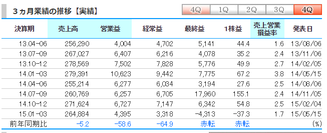 日本製紙 が3日続落。日経新聞が31日付で「日本製紙の2016年3月期の連結営業利益は230億円弱となり、前期(236億円)を下回るもようだ」と報じたことが売り材料。