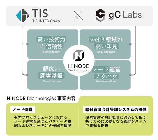 TISとgC Labsは、web3事業の立ち上げから運用までをワンストップで支援するコンサルティングサービス「NUE3(ヌエスリー)」の提供等、従前よりweb3領域における事業連携を行ってきました。このような中で、TISが有するシステム分野での豊富な知見および15,000社を超える顧客ネットワークと、gC Labsが有するノード運営および暗号資産管理ノウハウを融合させるなど、両社の連携を一層深めることで、ノード運営を主軸としたさらなる事業展開を図るべく、合弁会社の設立を決定しました。