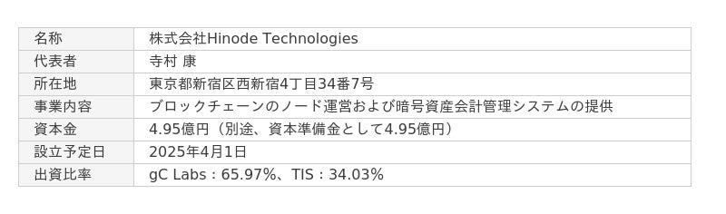 TISインテックグループのTIS株式会社(本社:東京都新宿区、代表取締役社長:岡本 安史、以下:TIS)と、株式会社gumi(本社:東京都新宿区、代表取締役:川本 寛之、以下:gumi)の連結子会社としてブロックチェーン事業を展開する株式会社gC Labs(本社:東京都新宿区、代表取締役:寺村 康、以下:gC Labs)は、合弁会社である株式会社Hinode Technologiesの設立に関する基本合意契約を2025年3月12日に締結したことを発表します。