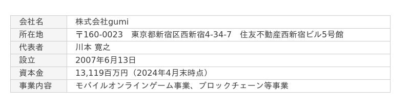 gumiは、「Wow the World! すべての人々に感動を」をMissionに掲げ、モバイルオンラインゲーム事業とブロックチェーン等事業の二つの事業を展開しています。モバイルオンラインゲーム事業では、『当社ゲームエンジン×IP』を軸とした収益性の高いタイトル開発を推進するとともに、開発受託にも注力しております。ブロックチェーン等事業では、ブロックチェーンゲーム等のコンテンツ開発、暗号資産を基盤にしたプラットフォーム構築、有力ブロックチェーンのノード運営、グローバルにおけるファンド投資等を行っております。