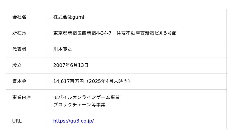 gumiは、「Wow the World! すべての人々に感動を」をMissionに掲げ、モバイルオンラインゲーム事業とブロックチェーン等事業の二つの事業を展開しています。モバイルオンラインゲーム事業では、『当社ゲームエンジン×IP』を軸とした収益性の高いタイトル開発を推進するとともに、開発受託にも注力しております。ブロックチェーン等事業では、ブロックチェーンゲーム等のコンテンツ開発、暗号資産を基盤にしたプラットフォーム構築、有力ブロックチェーンのノード運営、グローバルにおけるファンド投資等を行っております。