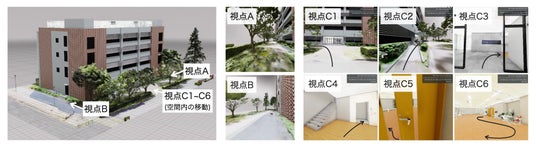 (視点A、B)建物の外に立った時の視界 (視点C1)建物の外の正面から左折 (視点C2)スロープの通過 (視点C3)自動ドアを通過して右折 (視点C4)エレベータに搭乗して2階に移動 (視点C5)手動ドアを通過して左折 (視点C6)室内移動の視界(筑波大学 システム情報系 上原皓助教より提供)