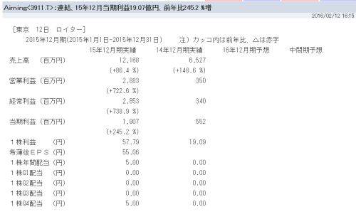 何か残念な感じです。今日は、2通届いてまして、 ・3911 Aiming・3914 JIG-SAW Aimingは、過去、何度か売買して、好成績を上げている銘柄。マザーズの中でも、マザーズ指数との連動が低く、市況全体の流れと逆を行く銘柄……らしい。 安く仕込んでおくと、意外なところで急騰するので、意外性に期待して持っている感じ。 で、今日のメインテーマは、JIG-SAW 招集通知が来るという事... ...続きを読む -
