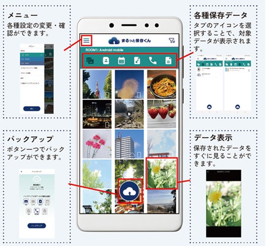 本サービスは、iOS、Androidスマートフォンに対応した、月額サブスクリプション型のクラウドバックアップサービスです。スマートフォン初心者にもわかりやすいシンプルな操作によって、スマートフォン内の連絡先やカレンダーなどのデータや、写真・動画などの大容量のデータを容量無制限のクラウドストレージに安全にバックアップできるほか、専用アプリやPCのWebブラウザからいつでもデータを閲覧できるオンラインビューア機能に対応しています。さらに、ひとつの契約で最大3台までのスマートフォン端末に対応し、異なるプラットフォーム間でもスムーズなデータ移行が可能であるなど、本格的なクラウドバックアップ機能を、月額550円(税込)で実現しています。