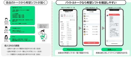 本サービスは、アルバイト従業員と店舗管理者のコミュニケーションを改善するバイトコミュニケーションアプリで、安心・安全なアルバイト連絡、ストレスのないシフト調整を行えるプラットフォームを提供します。