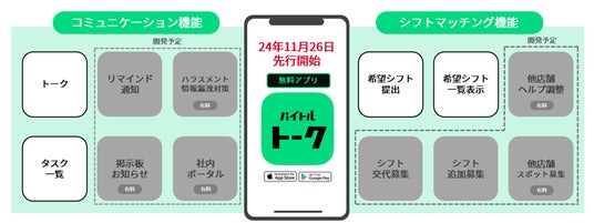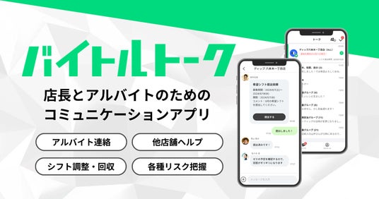 株式会社アイリッジ(本社:東京都港区、代表取締役社長:小田 健太郎、東京証券取引所グロース:3917、以下「アイリッジ」)は、ディップ株式会社(本社:東京都港区、代表取締役社長 兼 CEO:冨田 英揮、以下「ディップ」)と共同で、店舗管理者とアルバイト従業員のコミュニケーションを改善する新サービス「バイトルトーク」(以下、「本サービス」)を開発し、本日よりサービスを先行開始しましたことをお知らせします。