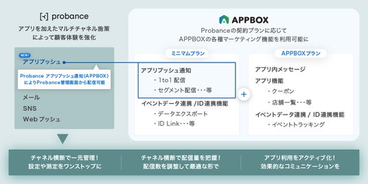 これにより、「Probance」のマルチチャネル施策に新たにアプリが加わり、APPBOXのプッシュ通知、お知らせ配信機能やイベントデータ連携などの機能をワンストップで活用できるようになり、顧客接点がさらに強化されます。
