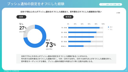 ・全体で7割以上の人がプッシュ通知をオフにした経験があり、若年層では9割にのぼるなど経験割合が高い