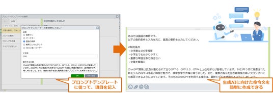 チャットボットに対して行う命令文(プロンプト)を、「プロンプトテンプレート」として作成・利用できるようになりました。あらかじめ業務に役立つプロンプトを登録しておくことで、生成AIに不慣れなユーザーでもAIへの命令・会話をスムーズに進められるようになります。