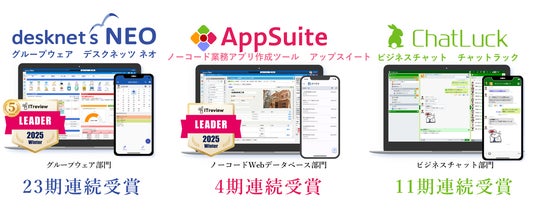 株式会社ネオジャパン(本社:神奈川県横浜市、代表取締役社長:齋藤 晶議)は、アイティクラウド株式会社(本社:東京都港区、代表取締役社長:黒野 源太)運営のIT製品比較・レビューサイト「ITreview」が主催する「ITreview Grid Award 2025 Winter」において、グループウェア『desknet's NEO』、ノーコード業務アプリ作成ツール『AppSuite』、ビジネスチャット『ChatLuck』が、それぞれ4部門で最高位である「Leader」を受賞したことをお知らせします。なお、desknet's NEOはグループウェア部門において2019年の受賞以来、今回の受賞で23期連続での受賞となりました。